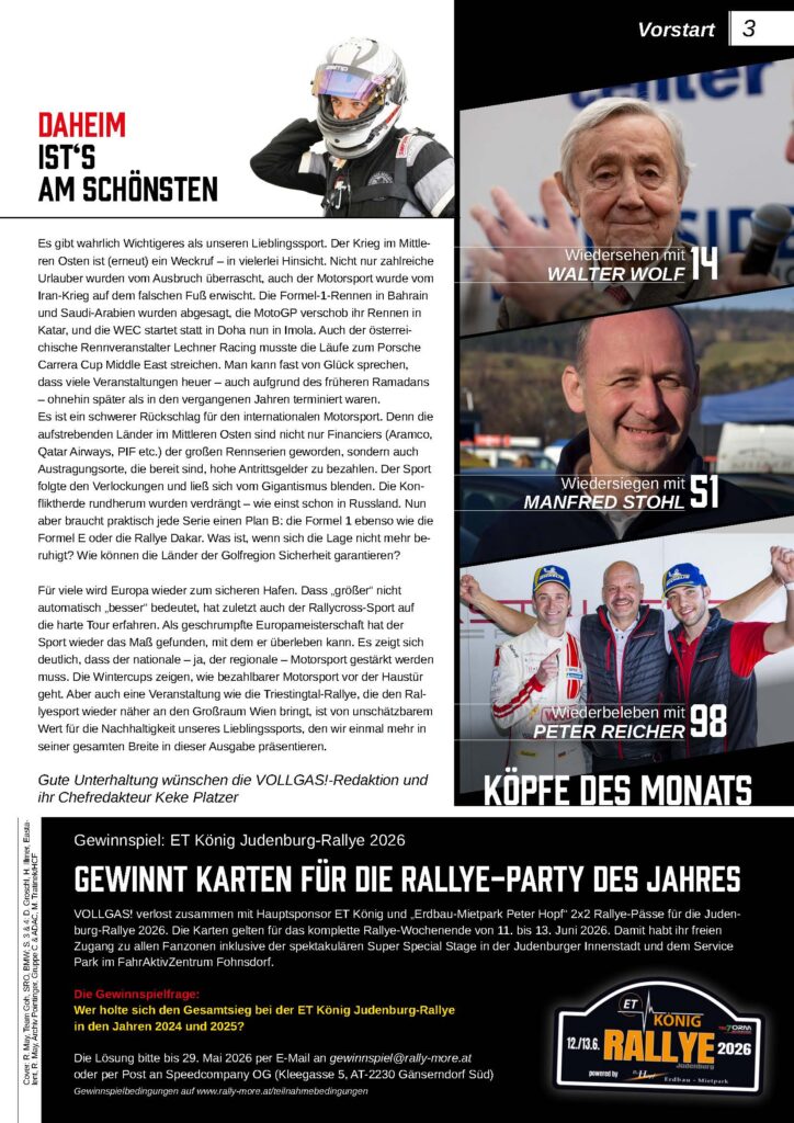 Für viele wird Europa wieder zum sicheren Hafen. Dass „größer“ nicht automatisch „besser“ bedeutet, hat zuletzt auch der Rallycross-Sport auf die harte Tour erfahren. Als geschrumpfte Europameisterschaft hat der Sport wieder das Maß gefunden, mit dem er überleben kann. Es zeigt sich deutlich, dass der nationale – ja, der regionale – Motorsport gestärkt werden muss. Die Wintercups zeigen, wie bezahlbarer Motorsport vor der Haustür geht. Aber auch eine Veranstaltung wie die Triestingtal-Rallye, die den Rallyesport wieder näher an den Großraum Wien bringt, ist von unschätzbarem Wert für die Nachhaltigkeit unseres Lieblingssports, den wir einmal mehr in seiner gesamten Breite in dieser Ausgabe präsentieren.