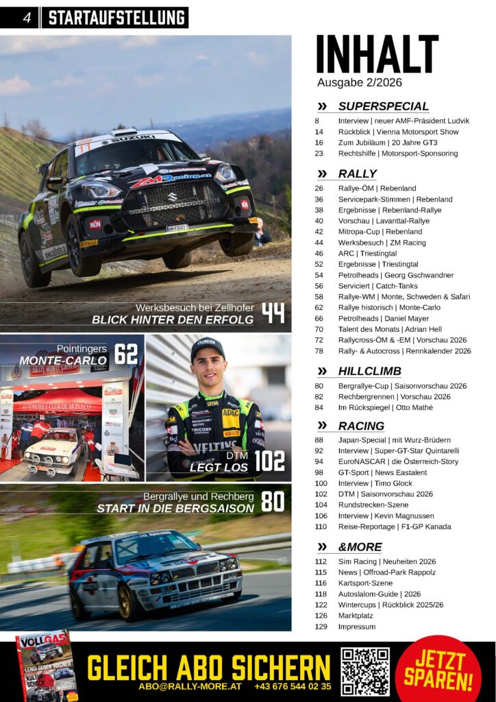 Im Schatten der Weltlage gibt’s zum Glück viel Positives aus dem heimischen Motorsport zu berichten. Neben den Frühlingsgefühlen bei Rallye, Berg & Co. haben wir auch einige internationale Topstars vors VOLLGAS!-Mikrofon bekommen.